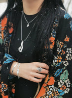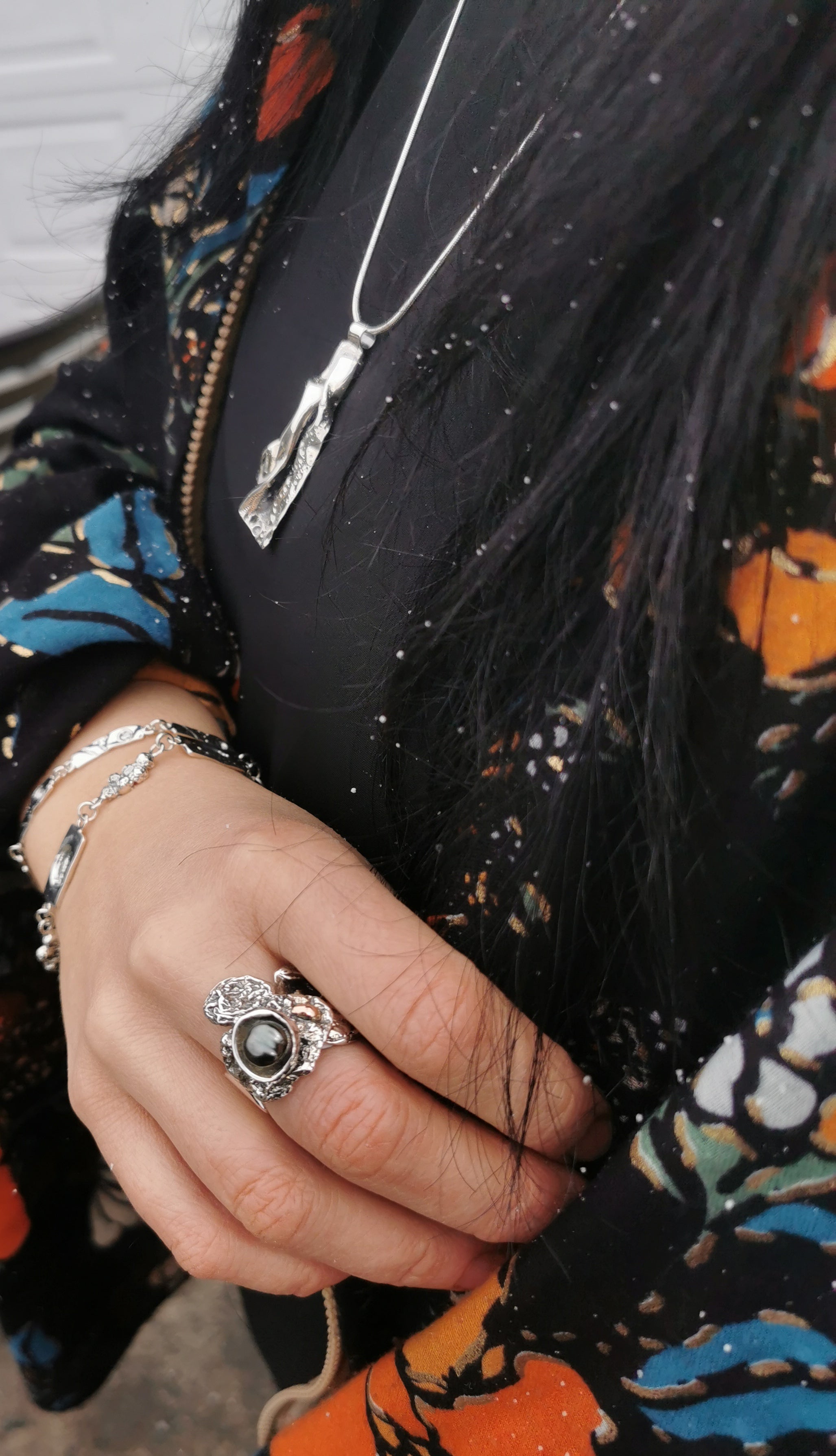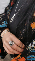 La finition oxydée accentue les détails texturés en créant un contraste saisissant entre les creux sombres et les parties polies de l'argent. La composition asymétrique, renforcée par des formes complexes et dynamiques, donne une allure sculpturale et contemporaine. Cette création reflète votre signature artistique : une fusion d'inspiration naturelle et d'originalité artisanale.