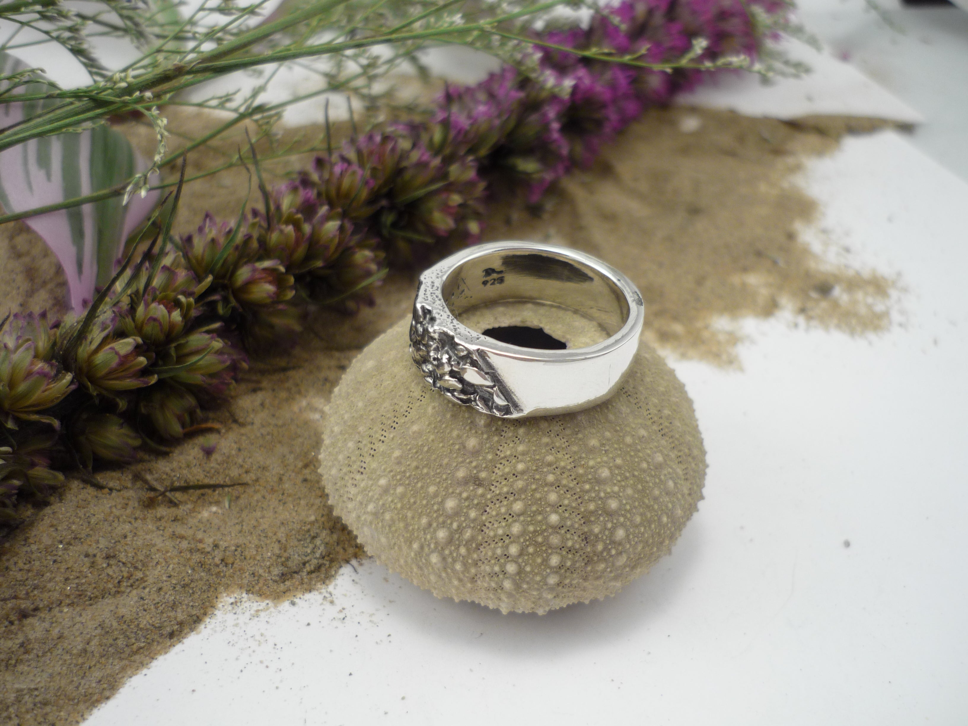 Voici le jonc L'APÉRO en argent sterling .925 avec une texture distinctive fabriquée à partir de graines de sésame. La texture est sur le dessus du jonc et le dessous est lisse.
