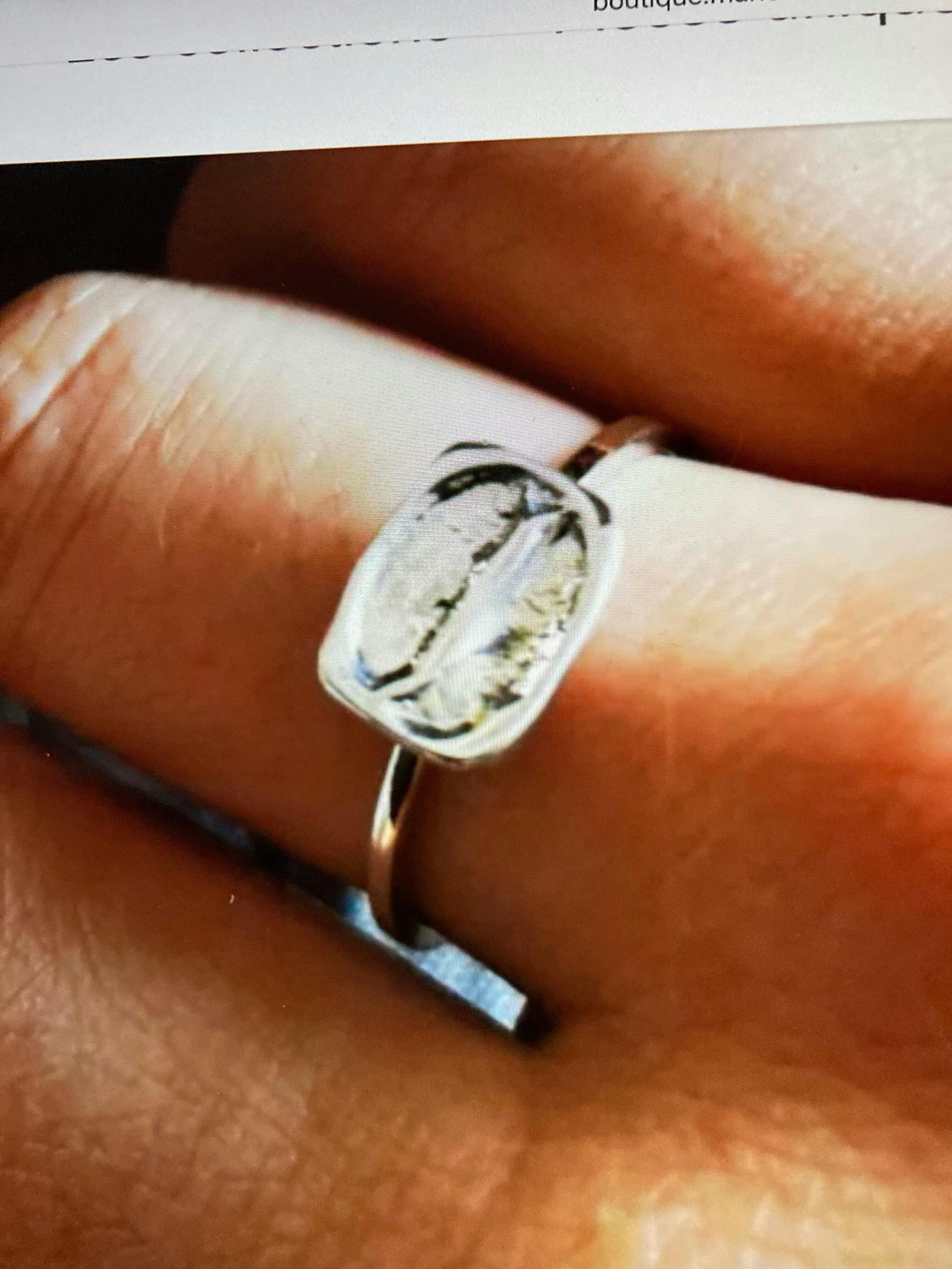 Bague délicate ESPRESSO COURT en argent sterling, petit rectangle avec une empreinte d'un grain de café.