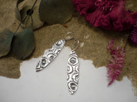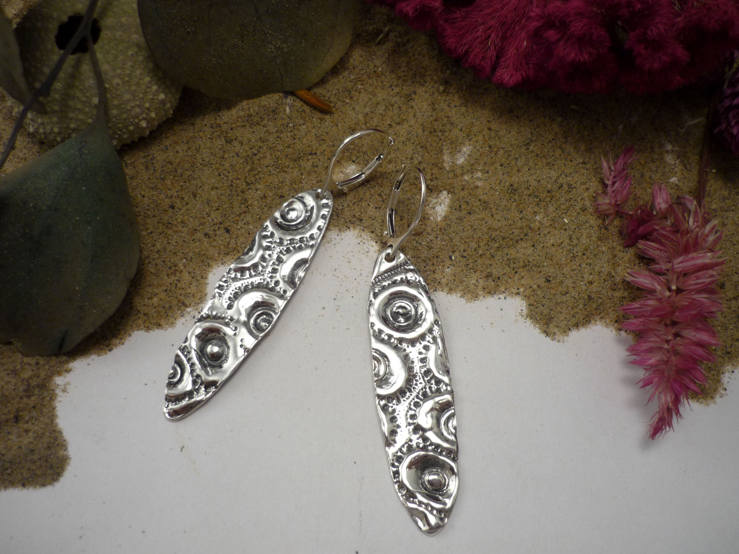 Boucles d’oreilles en argent sterling façonnées à la main, empreintes de la texture authentique d’un coquillage d’oursin de mer. Leur forme ovale allongée évoque le mouvement lent et profond des marées — une respiration calme, constante, vivante.