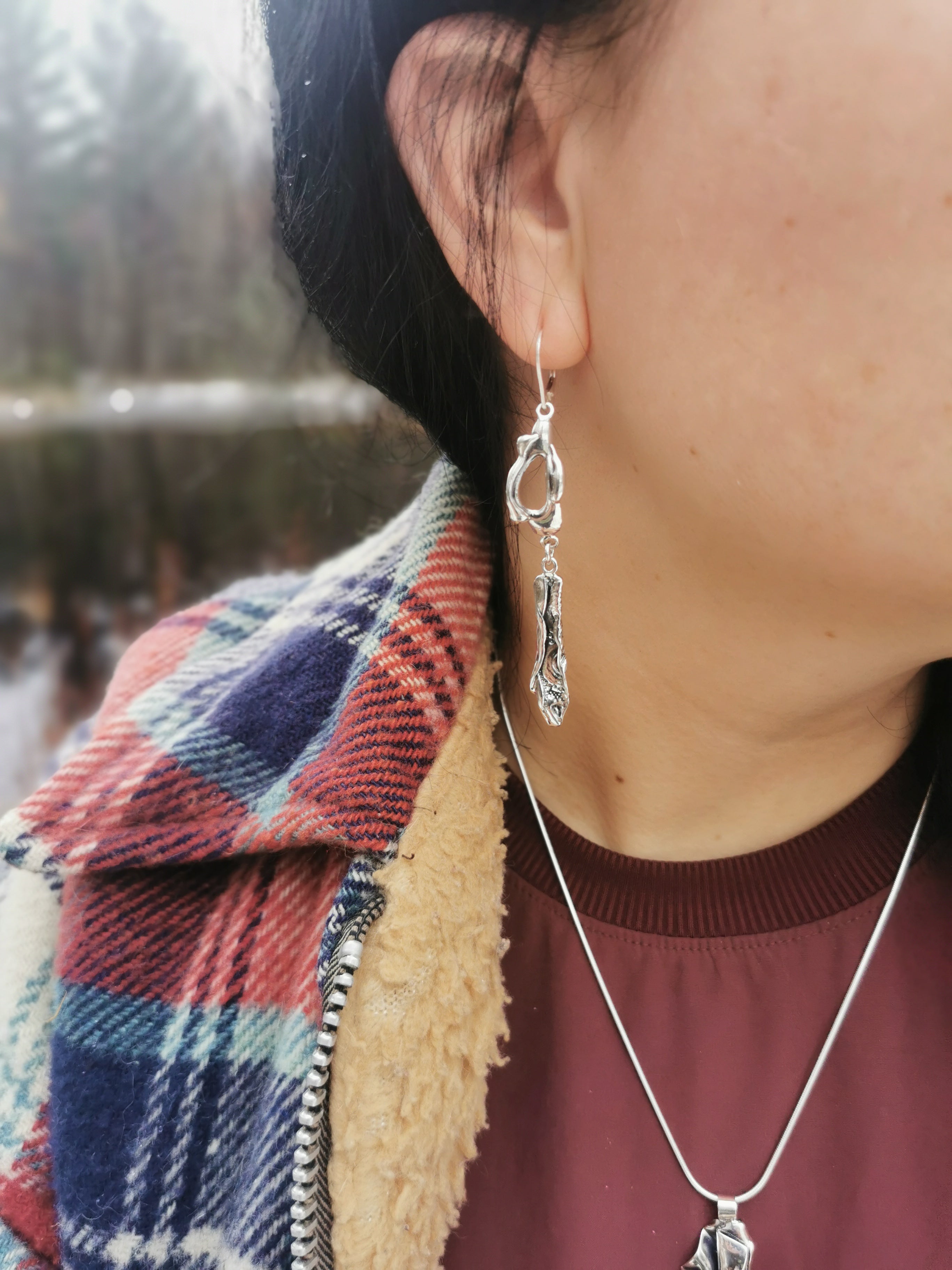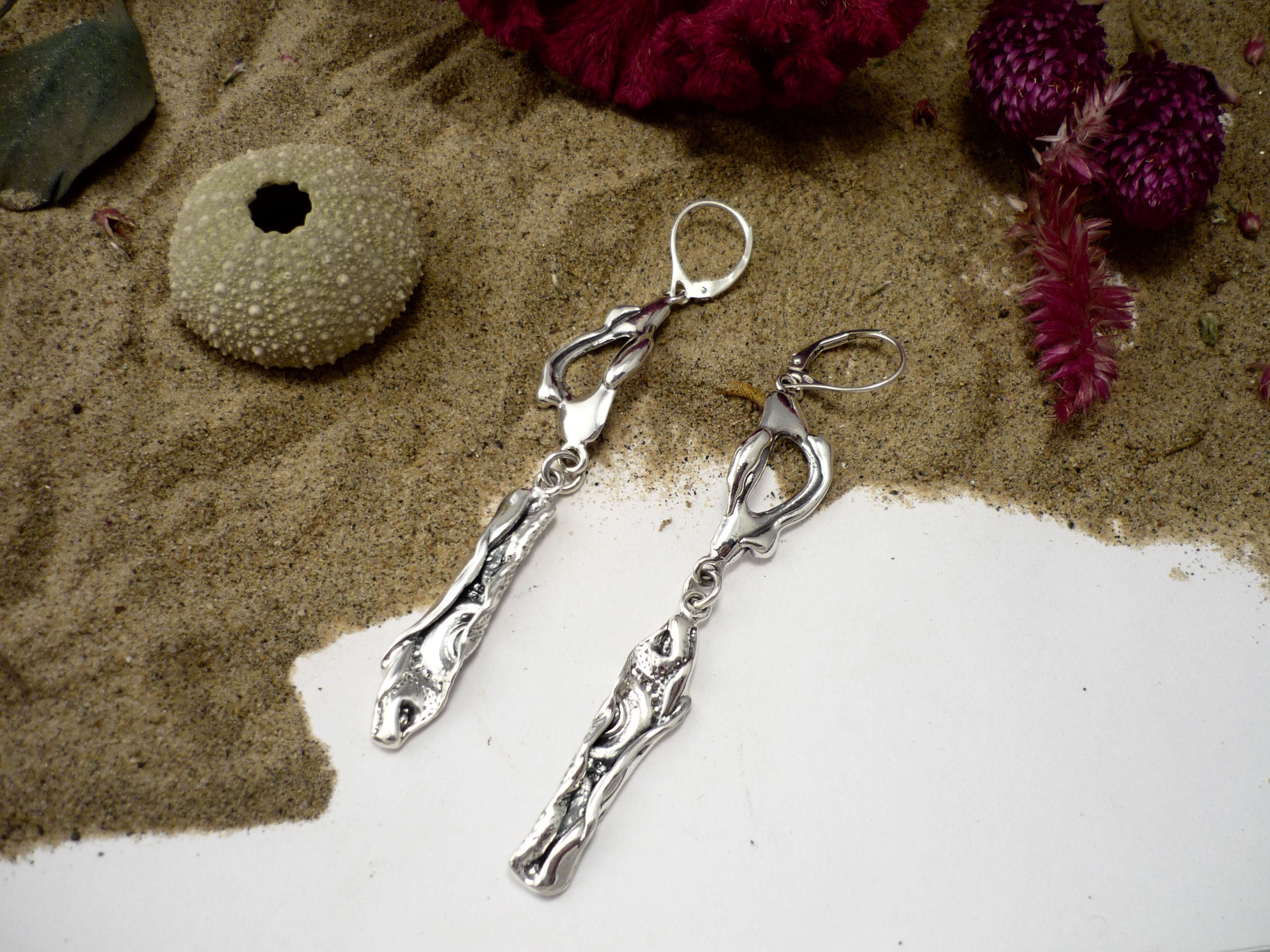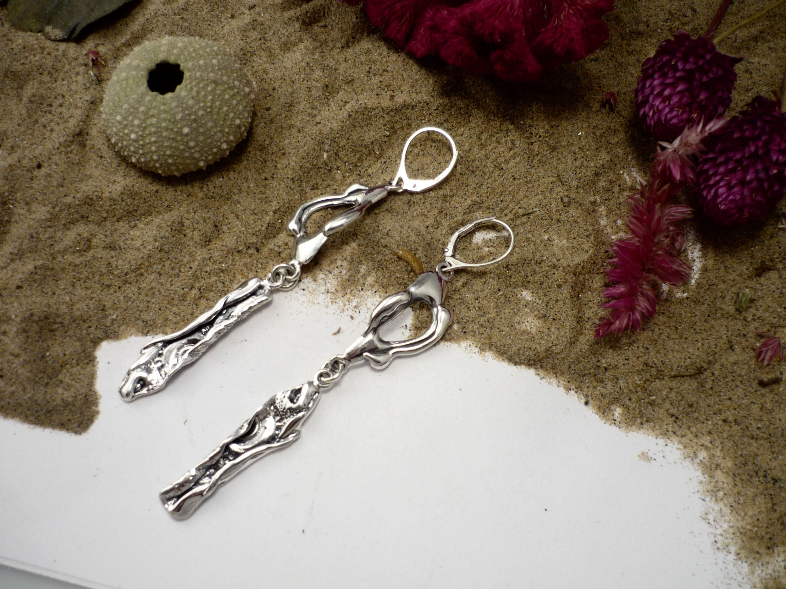 Ces boucles d'oreilles en argent sterling présentent une élégante forme. Leur surface est richement texturée avec des motifs évoquant des éléments marins, rappelant les coquillages ou les empreintes d’oursins. L’ensemble crée un équilibre entre nature et océan, avec une allure à la fois organique et sophistiquée.