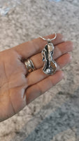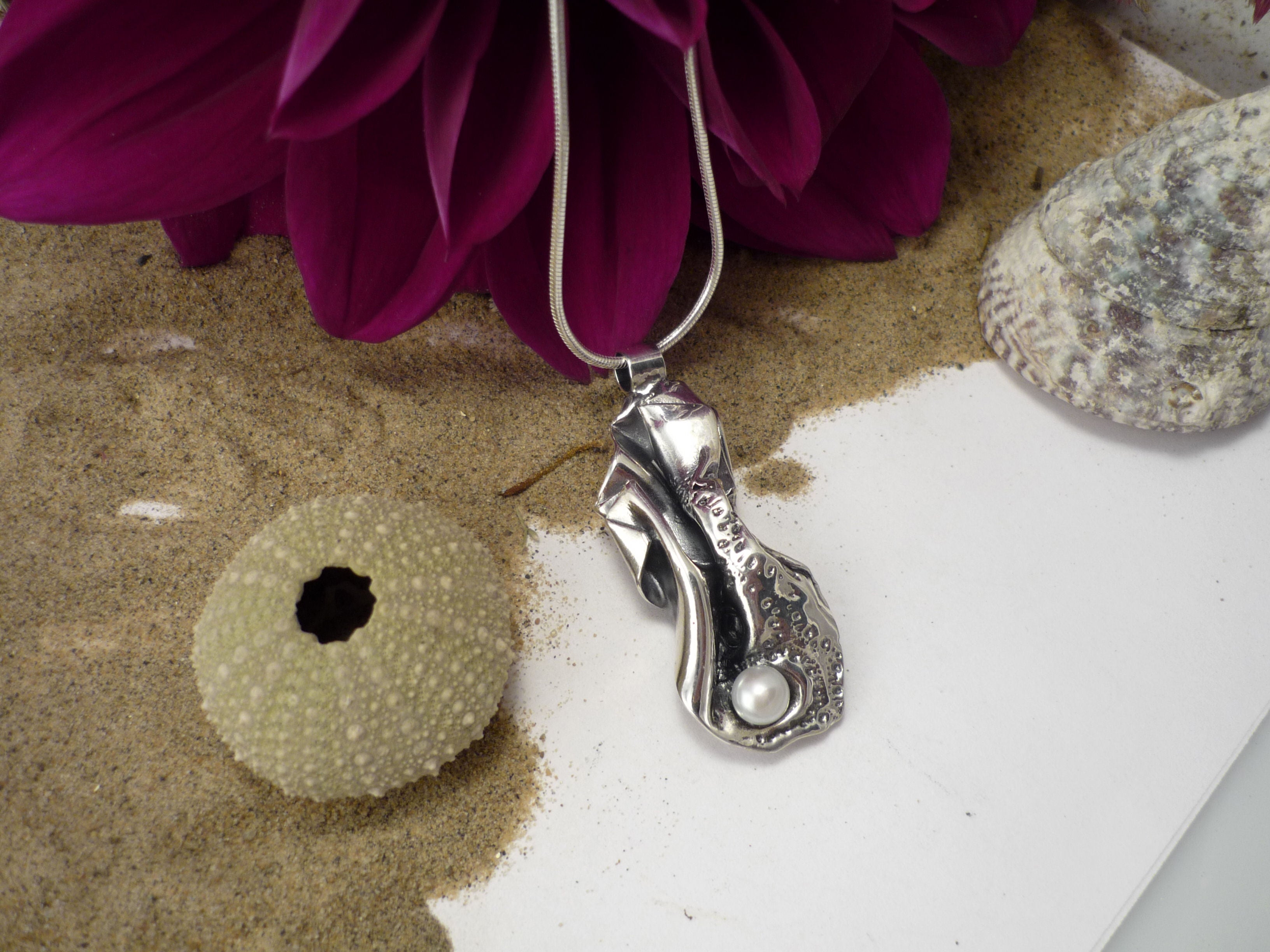 Reflet de marée capture ce moment où la mer se retire et laisse sur le sable des traces de lumière et de mouvement.  Chaque détail du pendentif évoque les ondulations de l’eau, les empreintes du temps et la douceur d’un souvenir marin.  Une pièce unique façonnée à la main en argent sterling, comme un fragment de marée figé dans le métal.