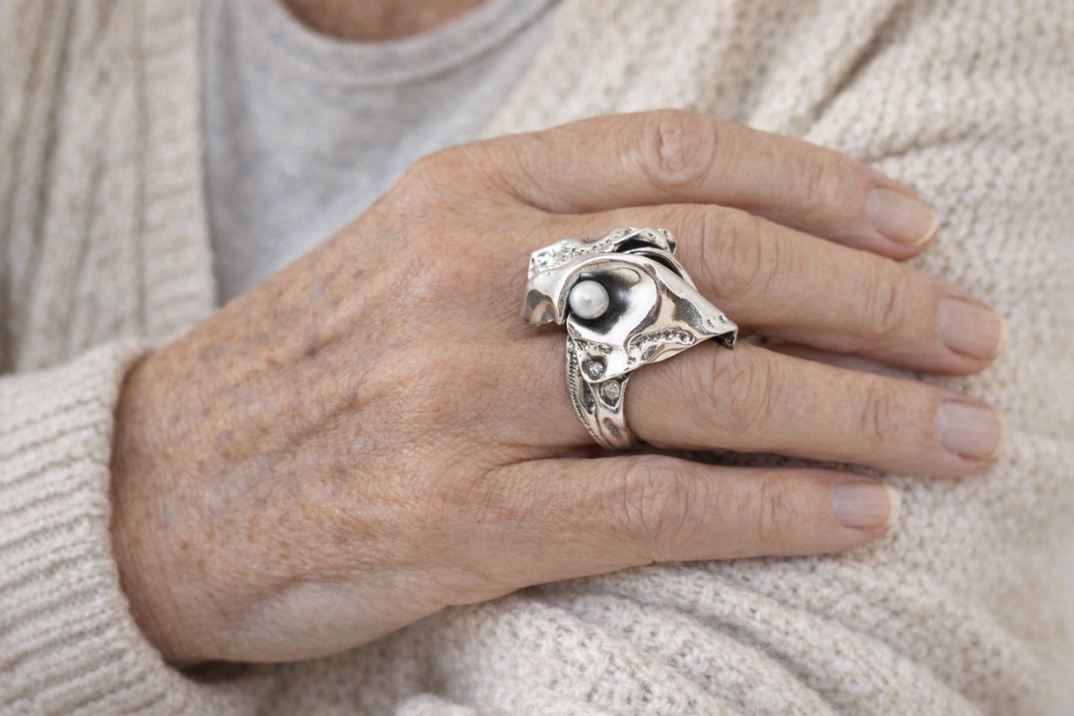 Cette bague en argent sterling est une pièce unique où cohabitent douceur et caractère. Fabriquée à la main, elle présente des ondulations organiques rappelant la mer : tantôt calmes et sages, tantôt libres et indomptables. Sa texture riche et enveloppante révèle un côté rebelle assumé, tandis que la perle blanche, douce et lumineuse, apporte une touche de sérénité.