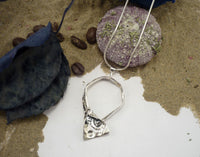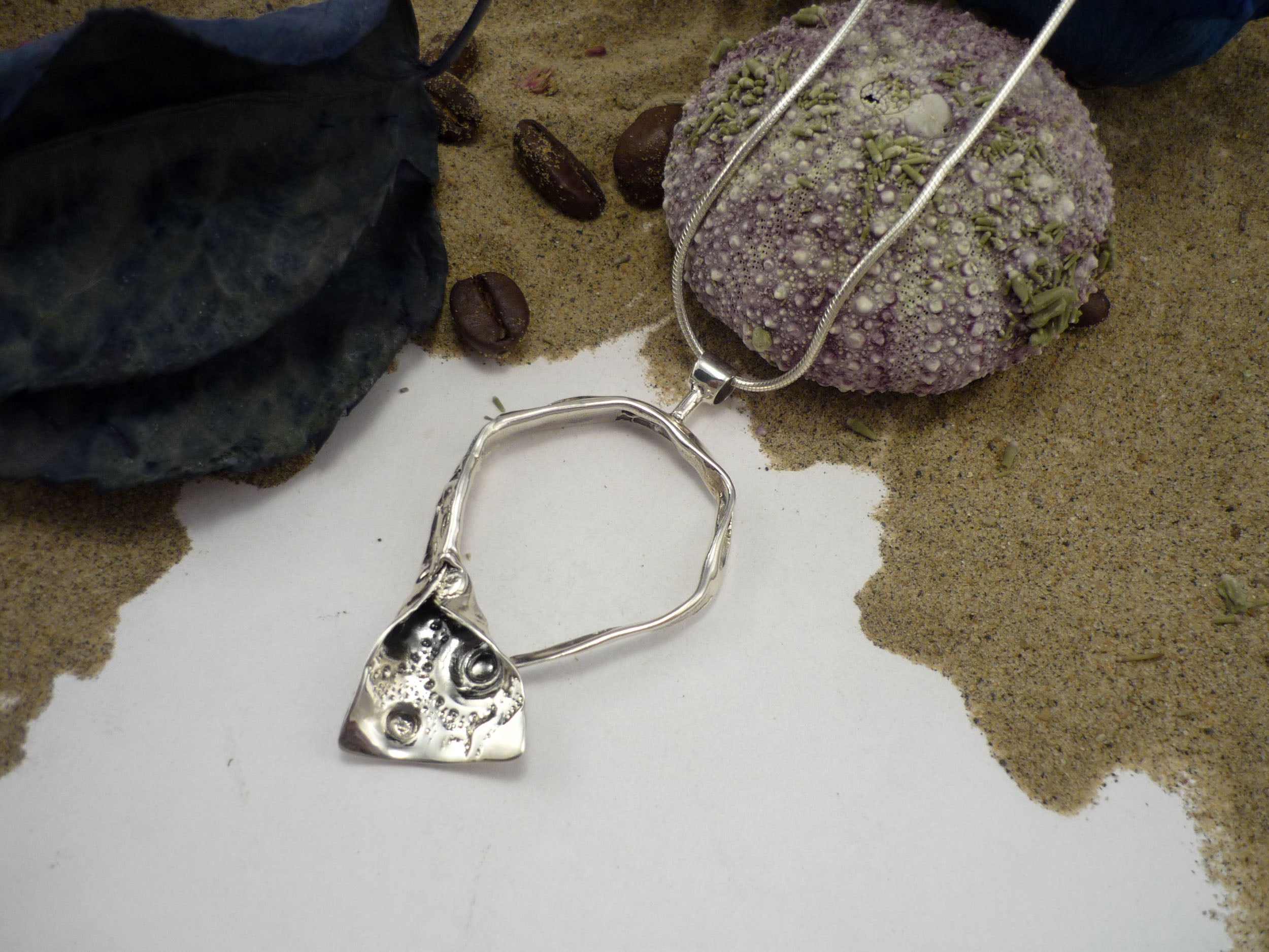 Tempête en mer est un pendentif unique façonné à la main en argent sterling. Son anneau organique, volontairement irrégulier, évoque le mouvement du vent et des vagues en pleine agitation.