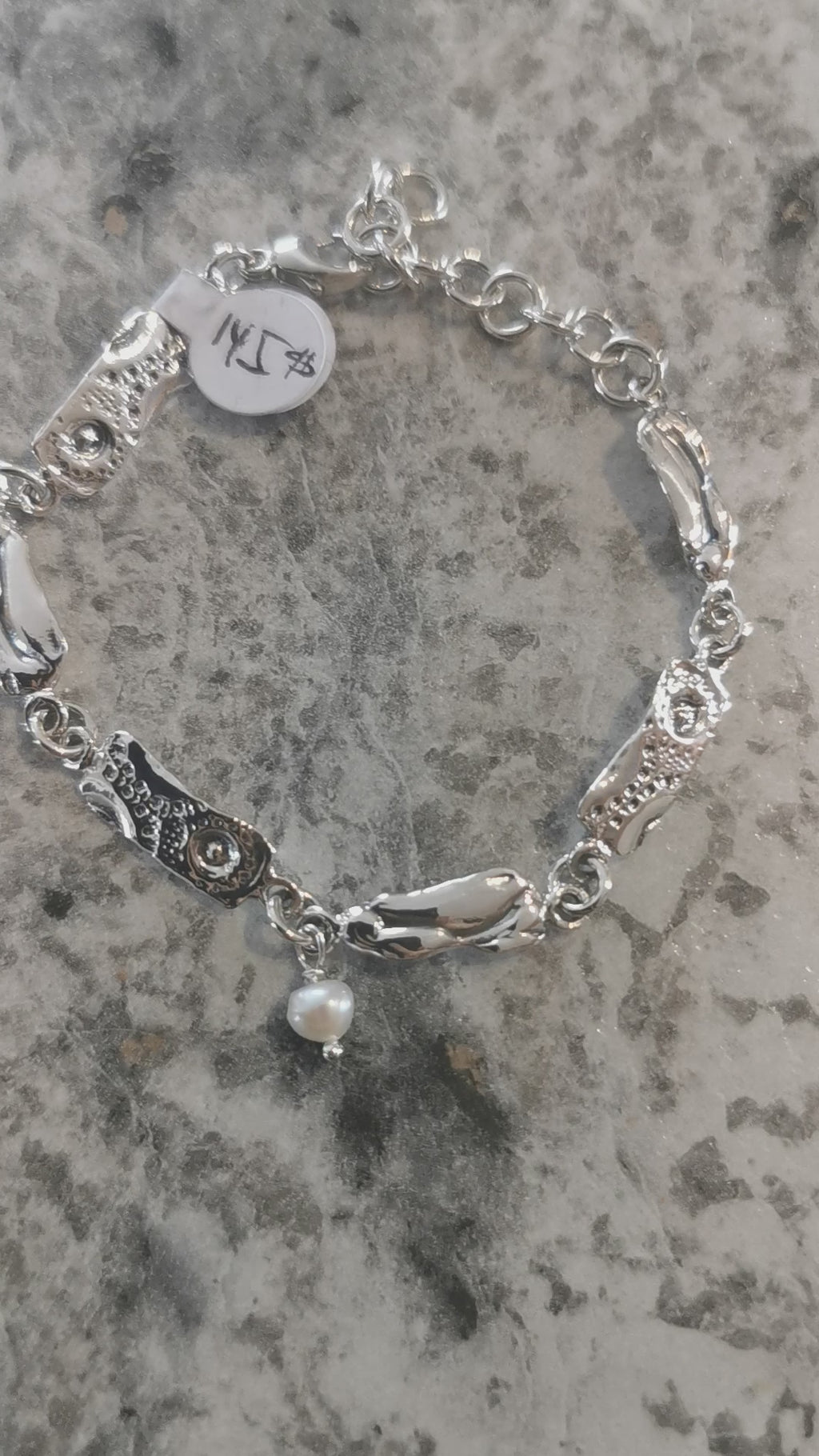 Voici le bracelet Bague énergisante perlée conçu en argent sterling agencé à une breloque perle d'eau douce.
