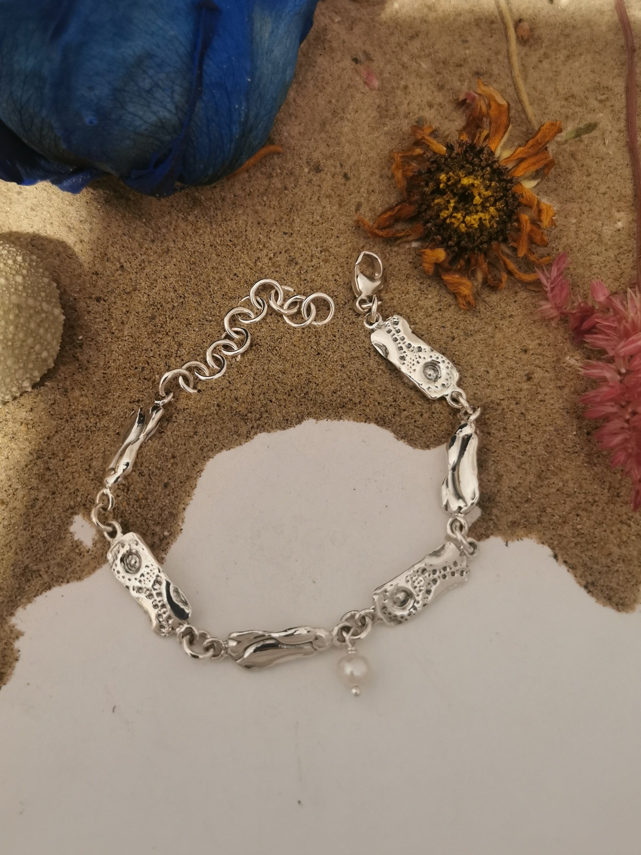Ce bracelet combine la simplicité des formes et des reliefs pour évoquer la liberté et la quiétude des vacances au bord de la mer. Les motifs aux allures de dentelle, mis en valeur par des cavités noircies, sont formés à partir d’une empreinte d’un coquillage d’oursin de mer.