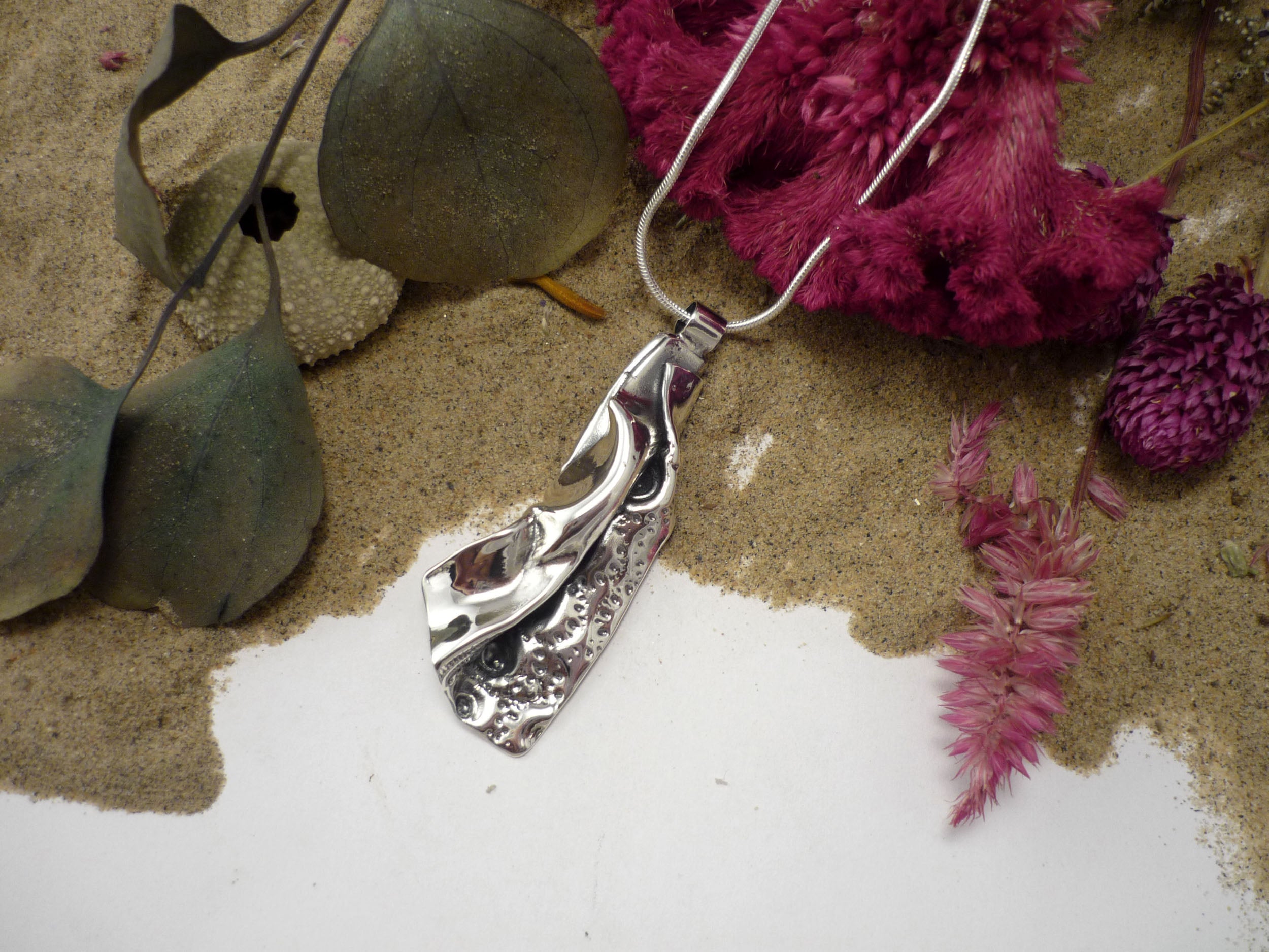 Ce pendentif en argent sterling au caractère doux et inspirant. Sa texture organique, façonnée à la main, révèle des détails subtils qui captent la lumière et éveillent l’imaginaire.