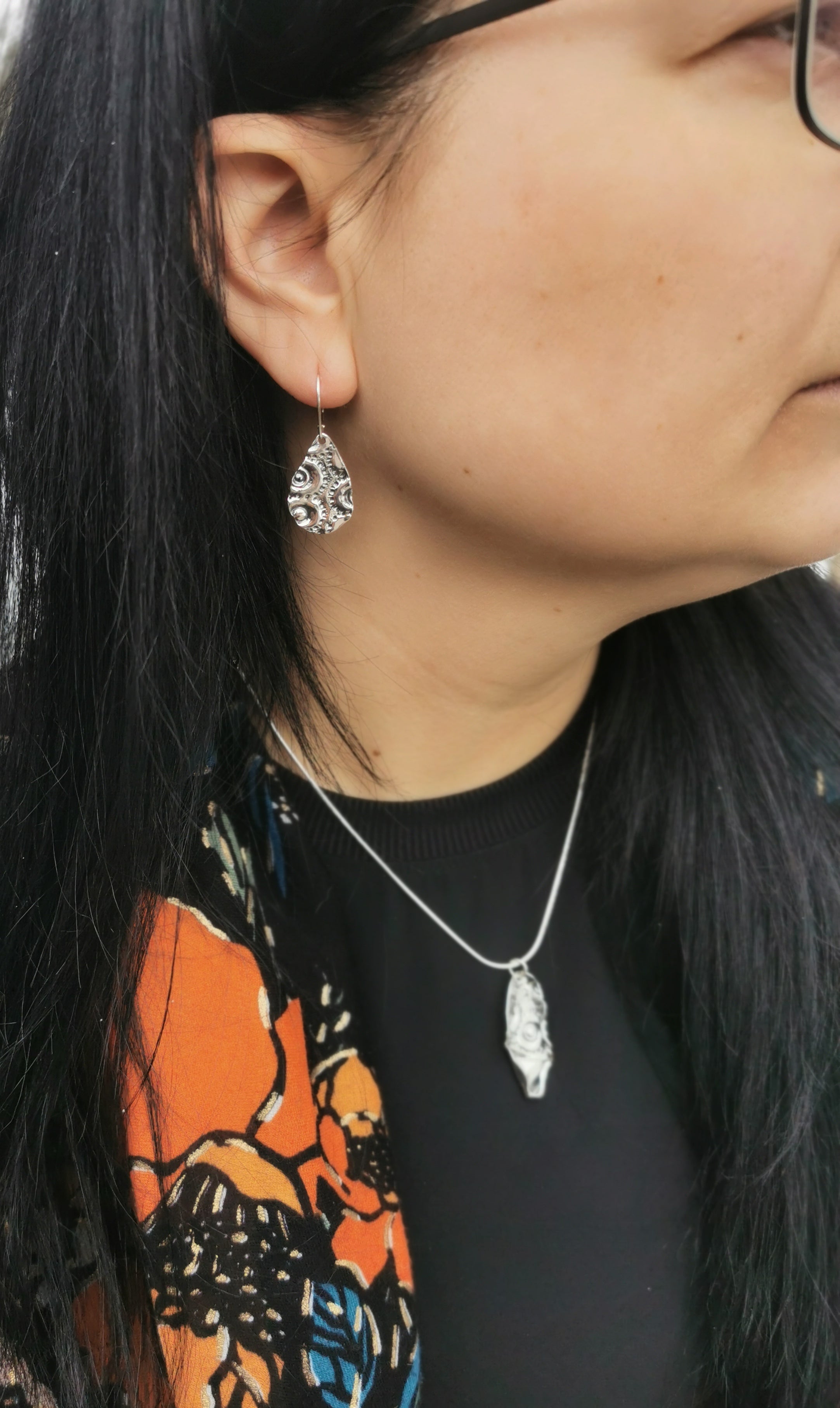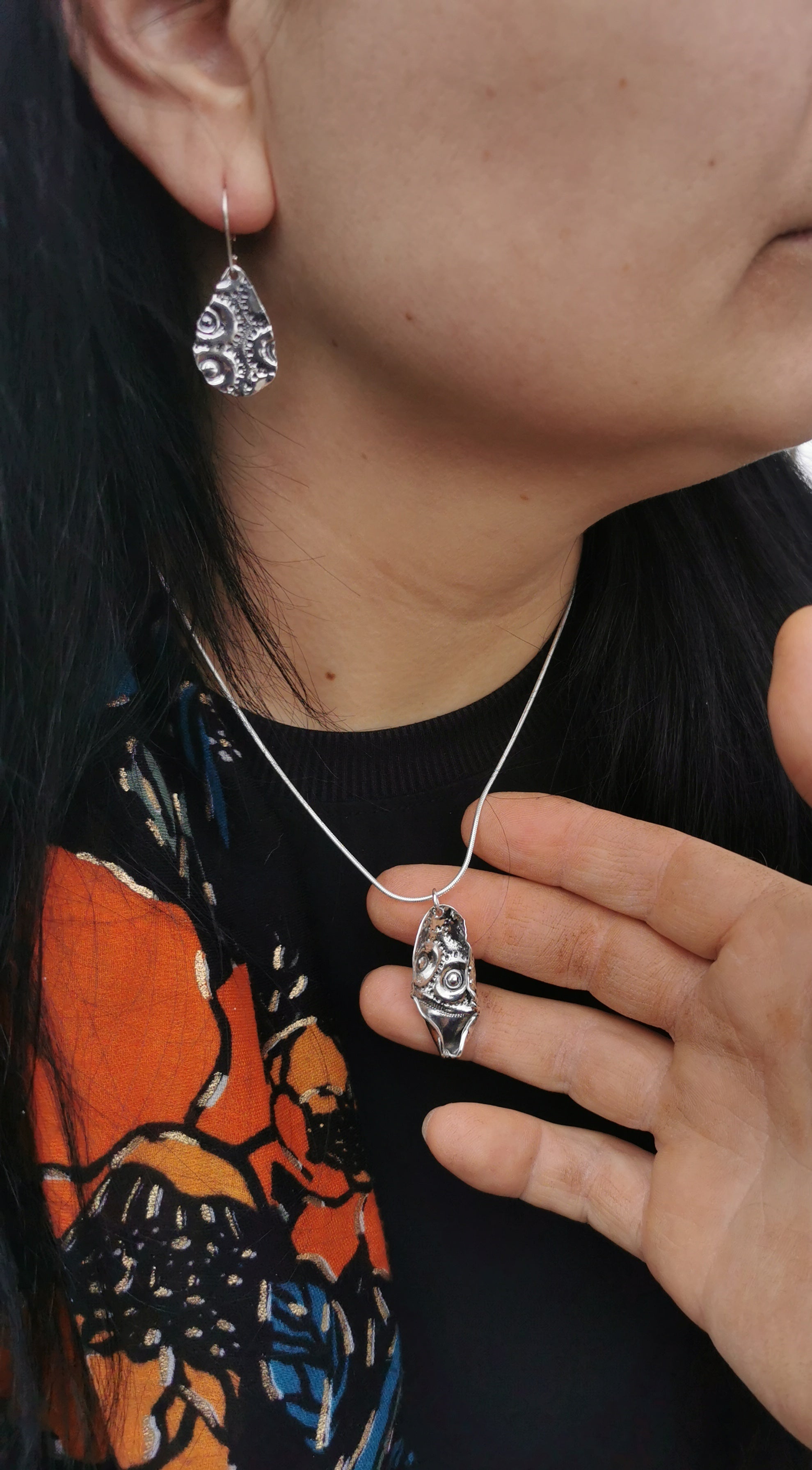 Primitive Leaf is a unique, handcrafted sterling silver pendant where the sea urchin imprint transforms into a plant silhouette. Its textured surface evokes a leaf sculpted by the tides, like a fragment gathered between land and ocean.