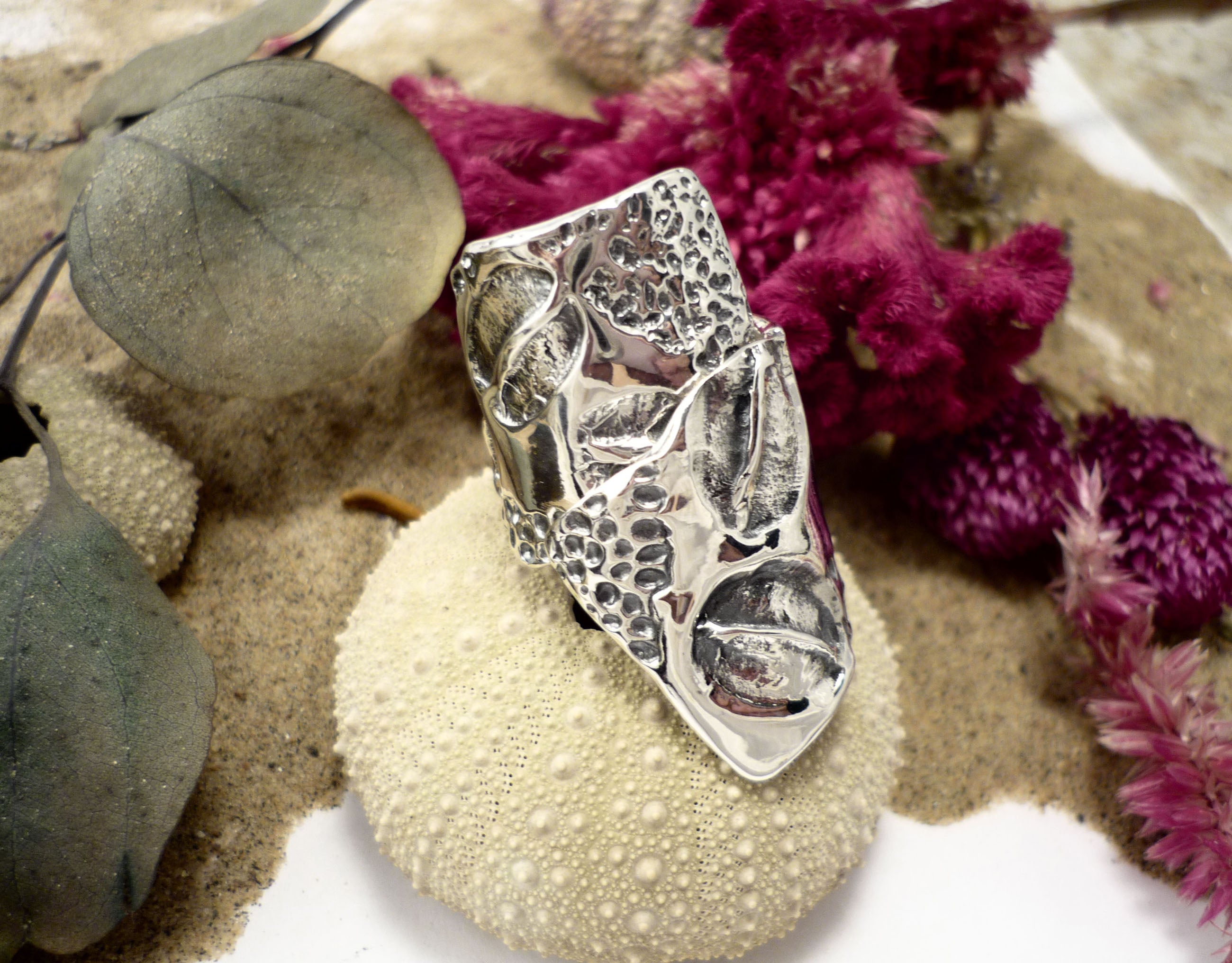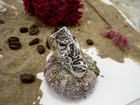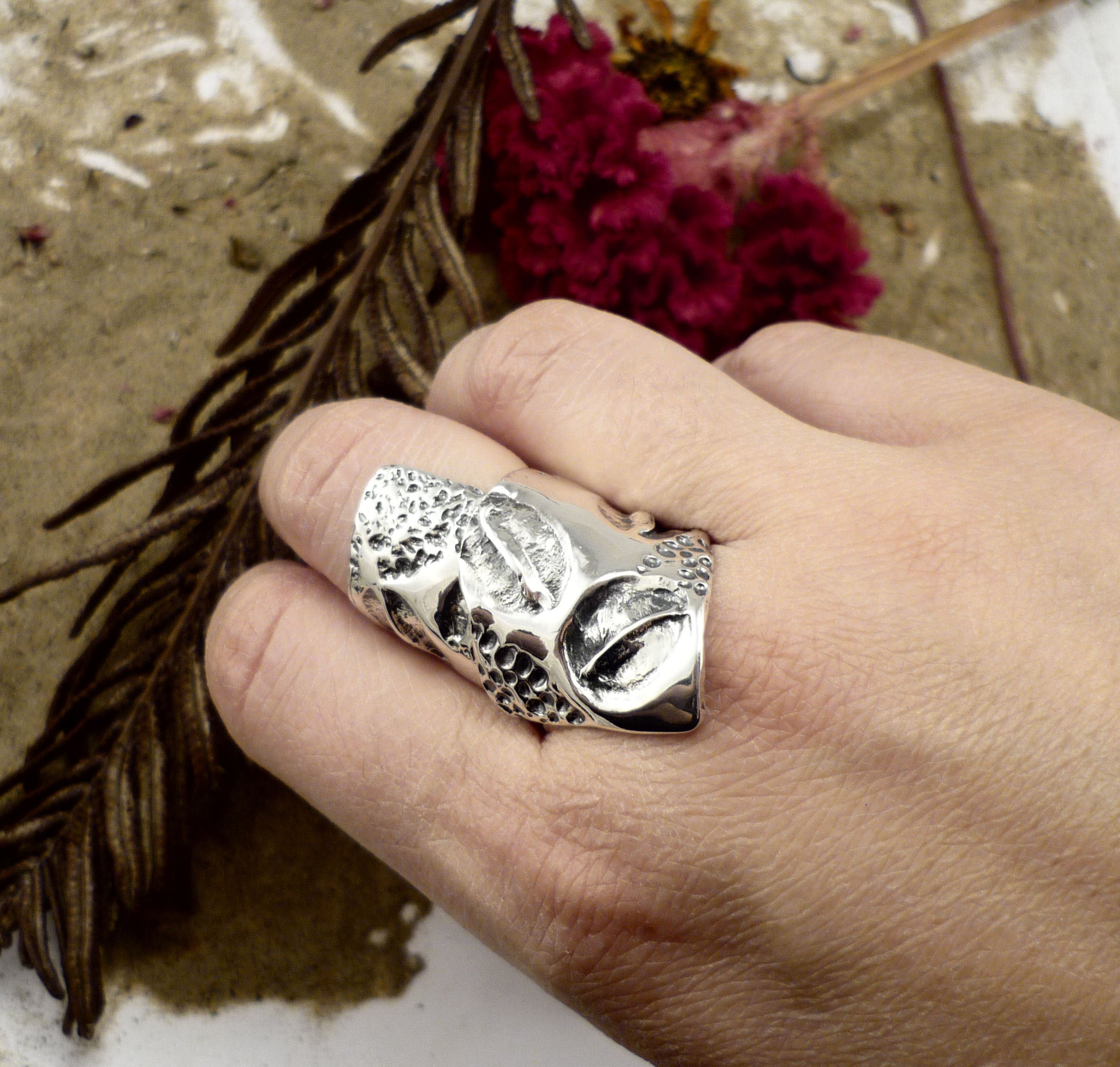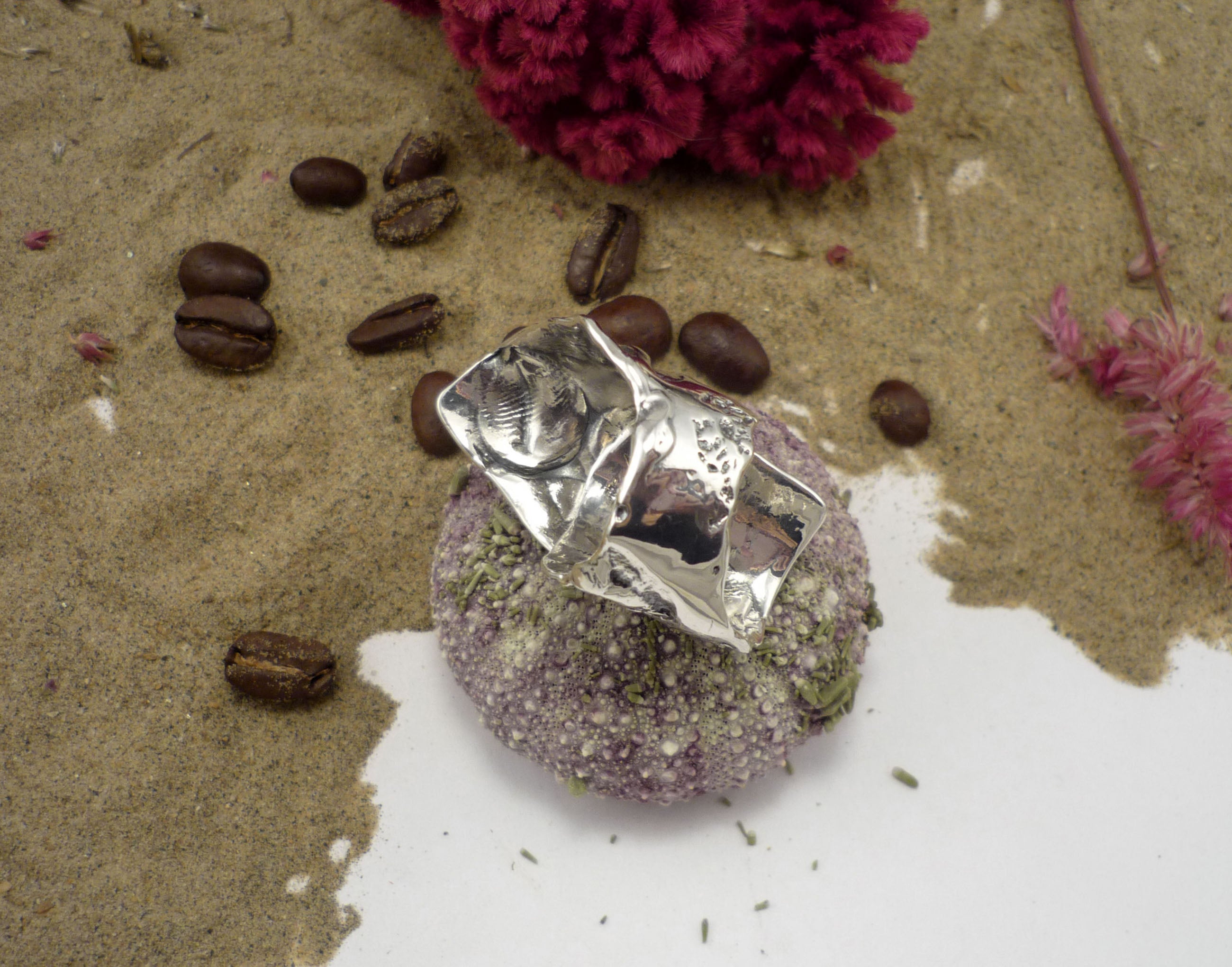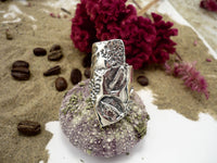Moka sauvage, bague argent sterling très large texturée de grains de café et de graines de moutarde et chia!
