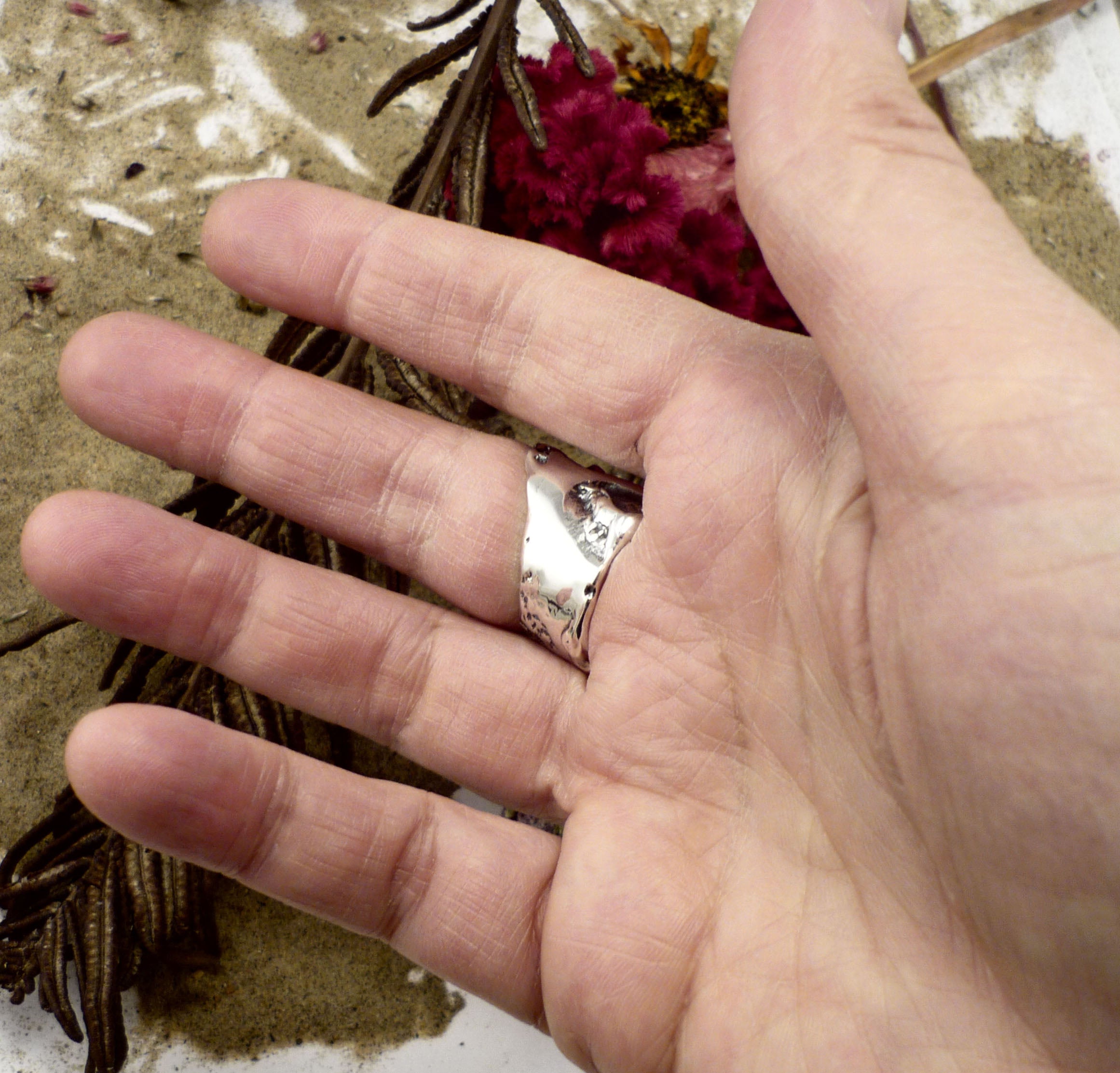 Cette bague en argent sterling (.925) est une pièce audacieuse et raffinée, conçue pour celles et ceux qui aiment les bijoux uniques et texturés. Façonnée à la main, elle prend la forme d’un ruban enroulé autour du doigt, offrant un design fluide et contemporain.