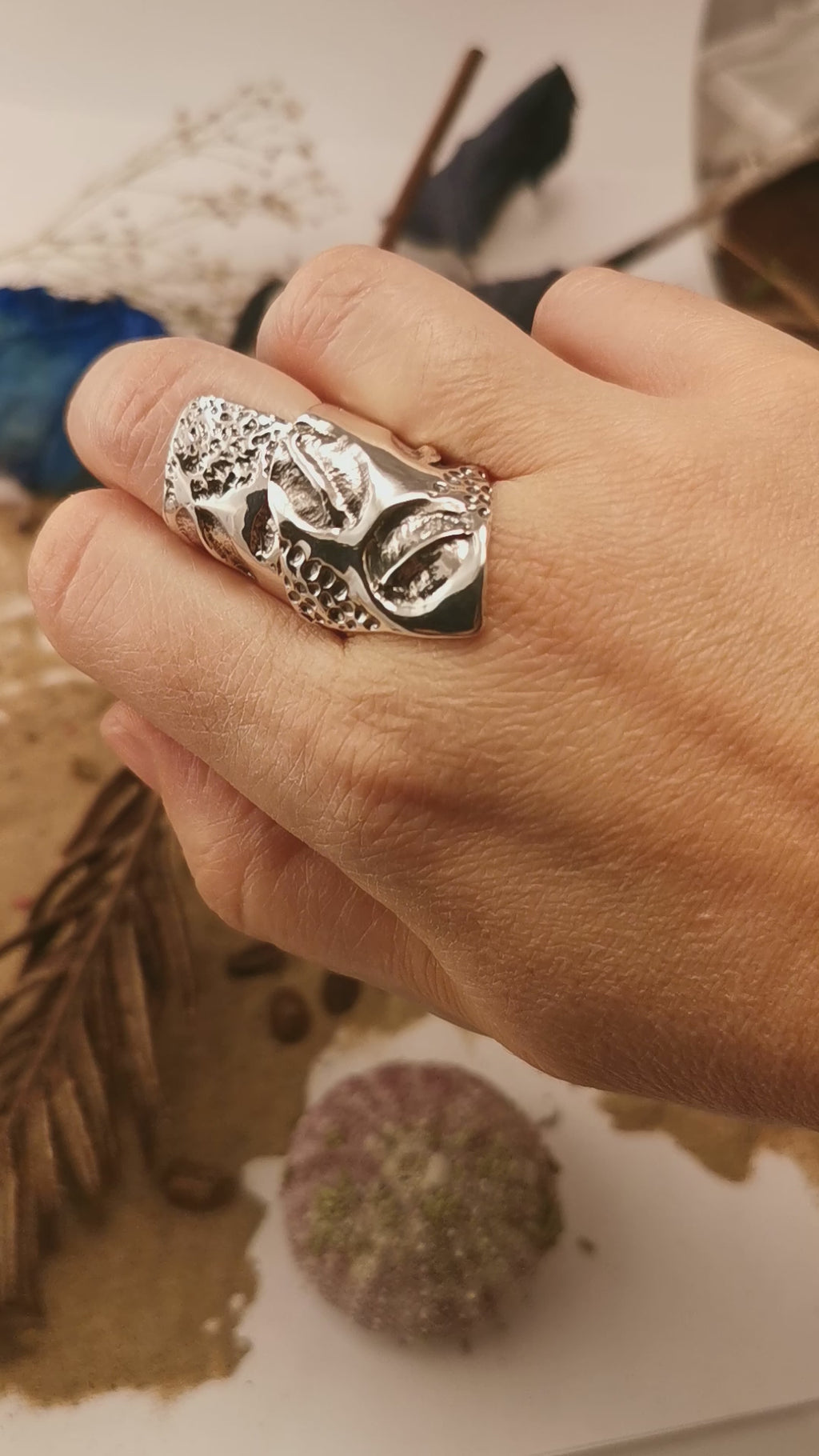La texture distinctive de cette bague est moulée sur des grains de café ainsi que des graines de moutard et chia, ajoutant une touche organique et tactile qui joue magnifiquement avec la lumière.